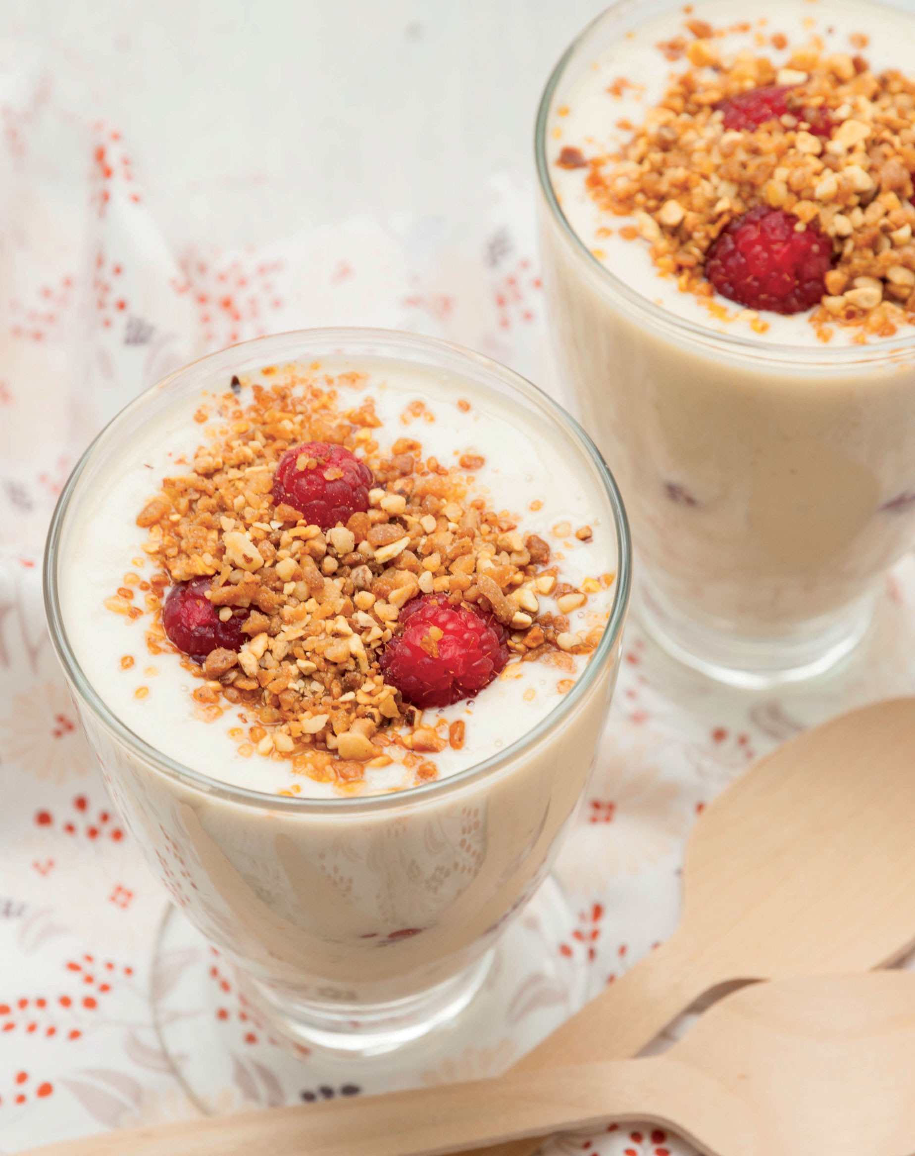 Ingrédients 80 g de tofu soyeux • 3 cuillerées à soupe de purée d’amande blanche • 150 g de banane • 3 cuillerées à soupe de sirop d’agave • 125 g de framboises • 20 g de pralin (mélange d'amandes et de noisettes caramélisées).