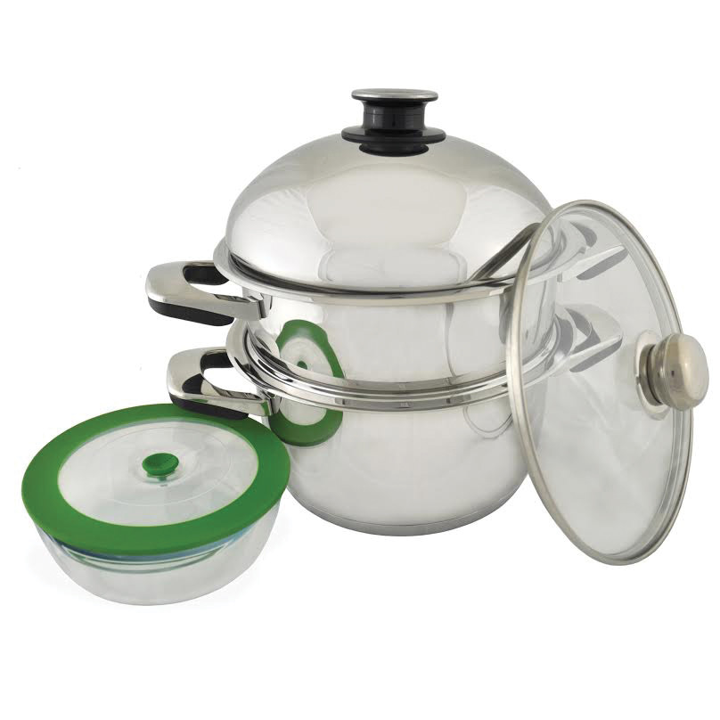 Si un cuit-vapeur ne permet habituellement que de cuire à la vapeur, de rares ustensiles jouent la multifonction : ils permettent à la fois une cuisson à l’étouffée et une cuisson à la vapeur. Dedans, vous pouvez aussi mijoter, faire revenir et réchauffer... Notre coup de cœur : le multicuiseur dôme en inox de chez ABE, qui dispose d’un fond thermodiffuseur très épais (12,5 mm) ainsi que d’un couvercle équipé d’un thermomètre afin de contrôler la température à l’inteérieur de l’ustensile (et non juste sous le couvercle !). Les formes spécifiques entre les différents éléments permettent la formation d’une étanchéité par joint d’eau, pour une cuisson à l’étouffée.